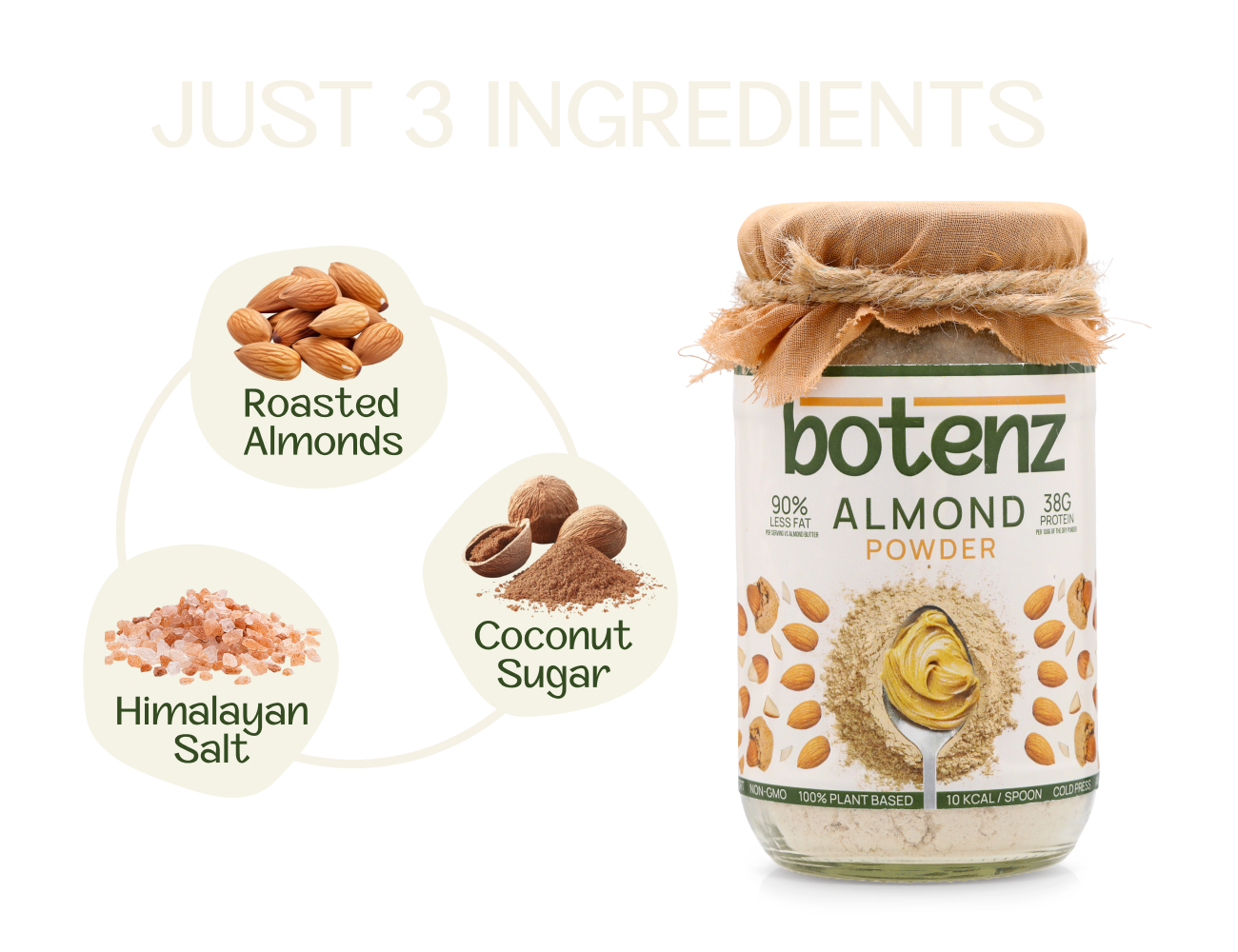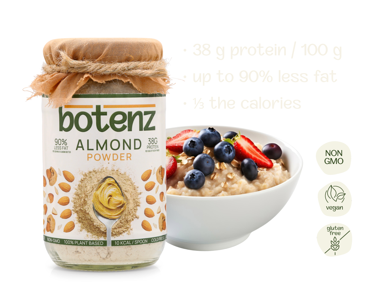Fresh Californian almonds are gently roasted to keep their clean, nutty flavour. A quick 5-second mix with water turns the powder into a smooth, creamy almond spread that feels much lighter than regular almond butter. With less fat, fewer calories and more natural almond protein per 100 g, the powder gives you the full almond experience in a more convenient, modern format.